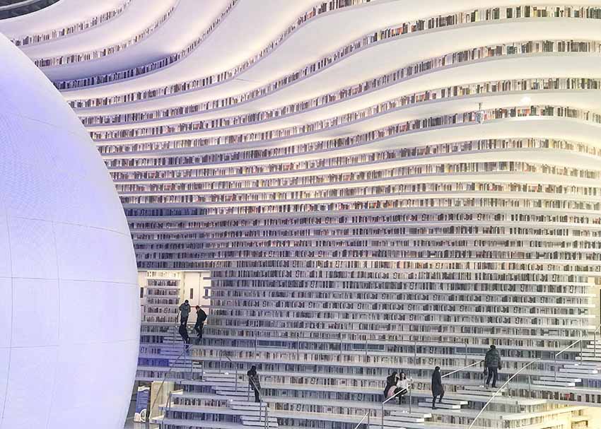 「普段、微博(@小喬是不是美女)をよく更新しているのですが、天津の図書館が話題になっていたので、足を運んでみました。始め、インターネットで寫真を見たとき、「上にある本はどうやって取るのだろう」と不思議でしたが、その疑問も解決されました(笑)」