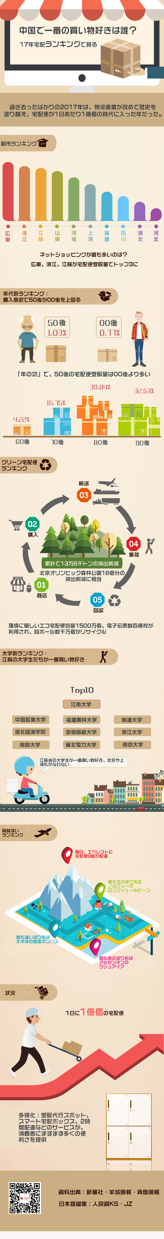 過ぎ去ったばかりの2017年は、物流産業(yè)が改めて歴史を塗り替え、宅配便が1日あたり1億個の時代に入った年だった。このほど阿里巴巴(アリババ)傘下の菜烏網絡科技有限公司が発表した2017年の宅配ランキングによると宅配便受取量の上位3省?自治區(qū)?直轄市には広東省、浙江省、江蘇省が並び、上海市は6位、北京市はベスト10から外れた。年代別にみると、50後(1950年代生まれ)は還暦を迎えた人が多いが、宅配便の受取量は全體の1.03%を占め、00後(2000年代生まれ)の0.77%を上回った。80後(1980年代生まれ)と90後(1990年代生まれ)は圧倒的な主力パワーで、それぞれ40%と30%近くを占め、70後(1970年代生まれ)が後に続いた。