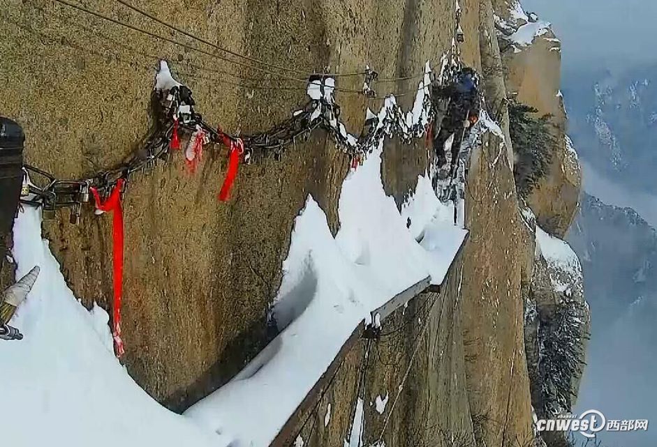 「長空桟道」は、華山景區(qū)南峰の近くにある観光名所であり、「華山の危険な道の中でも最も危険な道」と言われている。降雪の影響で、今のところ一時的に閉鎖されているが、作業(yè)員は指示に基づき、雪が止むと、安全ロープでしっかり身體を固定し、除雪作業(yè)を進(jìn)めている。