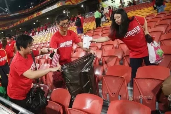 2015年にオーストラリアで行われたW杯のアジア予選の試合終了後、中國人サポーターがスタジアムに殘り、観客席のゴミ拾いを自発的に行った。しばらくすると、中國人サポーターが陣取っていた場所はきれいになり、世界に「中國人の民度」の高さを示した。