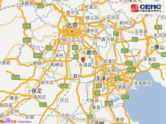 中國地震臺網(wǎng)の公式観測によると、12日午後6時31分、河北省廊坊市永清県(北緯39.37度/東経116.67度)でマグニチュード4.3の地震が発生し、その震源の深さは20キロメートルだった。同日午後8時までに、マグニチュード0以上の余震は11回観測され、うち最大の余震はマグニチュード1.8だった。
