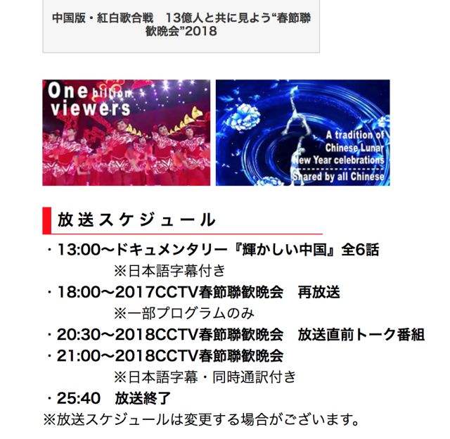 同サイトでは、春節(jié)聯(lián)歓晩會について、中國の舊正月を祝う年越しカウントダウン番組で、その絢爛豪華なステージと人々の心を捉えるような映像表現(xiàn)のほか、大スターによる歌やコント、京劇などが披露され、視聴率50%の圧倒的な人気を誇る中國の「紅白歌合戦」ような番組と紹介。さらに中國文化に詳しいゲストを招き、春節(jié)の風(fēng)習(xí)や「春晩」の見どころを紹介した。