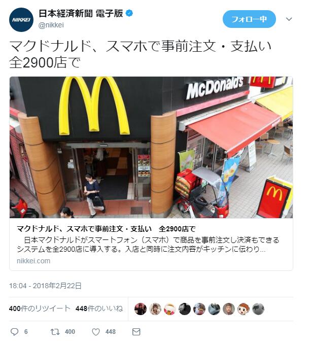 日本経済新聞(電子版)が伝えたマクドナルドのスマホによる事前注文?支払いサービス