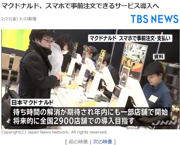 TBSのニュースでもマクドナルドのスマホによる事前注文?支払いサービスが伝えられた。