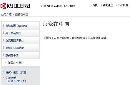 さらに、26日午後10時ごろ、、「中國での京セラ」が削除され、「このページは修正?メンテナンス中です。ご迷惑をお掛けして申し訳ございません」との文が表示された。