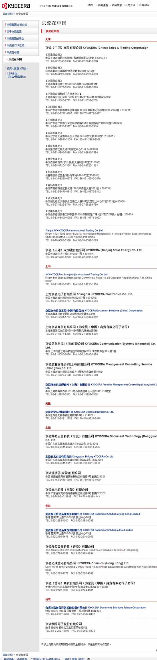 同日午後7時ごろ、「中國の京セラ」ページには、天津、上海、無錫、東莞、香港地區(qū)の下に、臺灣地區(qū)の関連會社2社の情報が表記されていた。(編集KN)