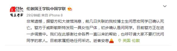 キングス?カレッジ?ロンドンの中國人學生學者聯誼會の公式微博(ウェイボー)は、「大変殘念なことに、警察と大使館の情報によると、ここ數日失蹤していた同校の博士課程留學生の閆思宏さんの死亡を確認したとのことです。警察側はウェストミンスター區(qū)で女性の遺體を発見し、この遺體が閆さんであるとみています。警察側は現在この件に関する捜査を進めています。ここに皆様のご協力に感謝するとともに、閆さんのご家族へのご配慮をお願いする次第です。現在のところ、ご家族は一切の取材をお斷りしています。ご理解のほどよろしくお願いします」とのメッセージを投稿した。