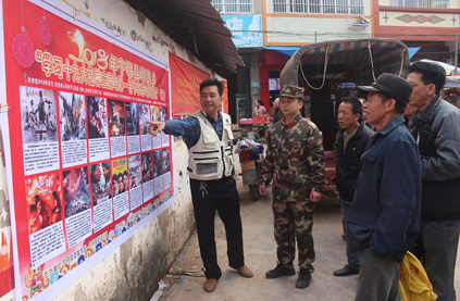 2月14日、映畫のポスターの前で、春節(jié)期間中に農(nóng)村を巡回して上映する予定の映畫と上映時間を説明する広西壯(チワン)族自治區(qū)寧明県峙浪郷の「愛民固辺映畫放映隊」の韋柯隊長(寫真一番左、撮影?周貽剛)