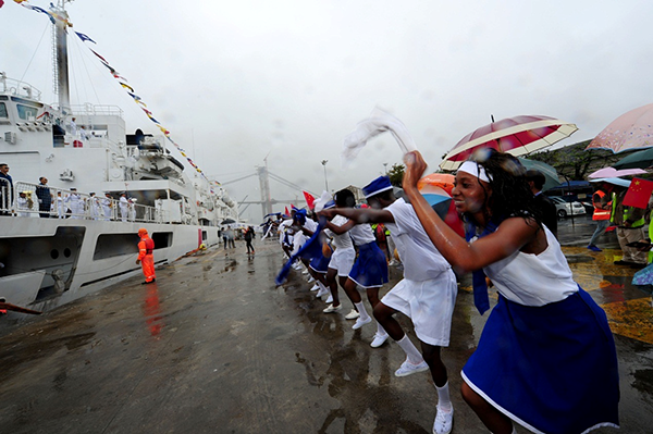 2017年11月7日、モザンビーク?マプト港の埠頭。中國海軍の病院船「平和の方舟」の初入港を民族舞踴で熱烈に歓迎する現(xiàn)地の民衆(zhòng)。(江山/人民図片)