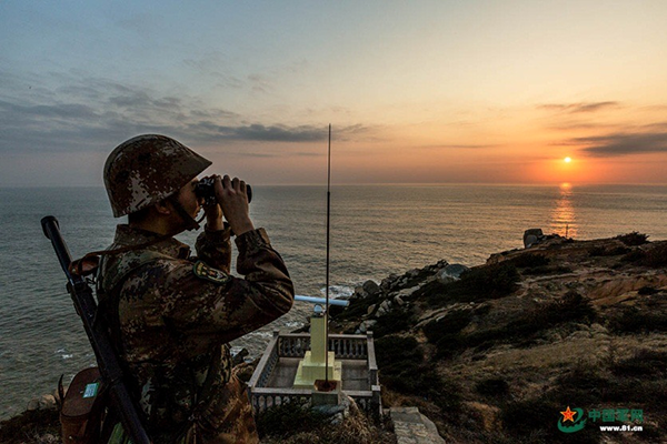2018年2月14日、中國南東沿海の小島「北礵」、パトロール中に海上の狀況を調(diào)べる東部戦區(qū)陸軍某海防中隊兵士。(寫真:中國軍網(wǎng))