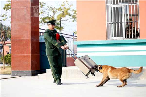 2017年11月30日、中國武裝警察宿遷支隊泗陽県中隊の王旭楽訓導員が退役。彼が訓練した警察犬は荷物をくわえ放さなかった。(呉佳洪/人民視覚)