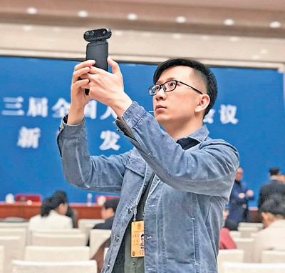 人民日報の記者は第13期全國人民代表大會第1回會議の記者會見をVR360度カメラで撮影した。