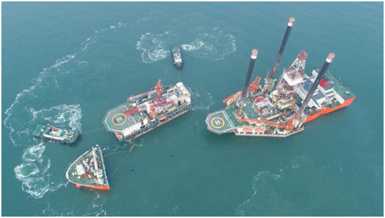 2018年2月8日、中國山東省煙臺港で船に積まれる石油掘削裝置「勝利四號」?!竸倮奶枴工取感聞倮惶枴工膝圣ぅ弗Д辚ⅳ魏Q笥吞铯蔷蛳髯鳂I(yè)を行う。(初陽撮影/人民視覚)