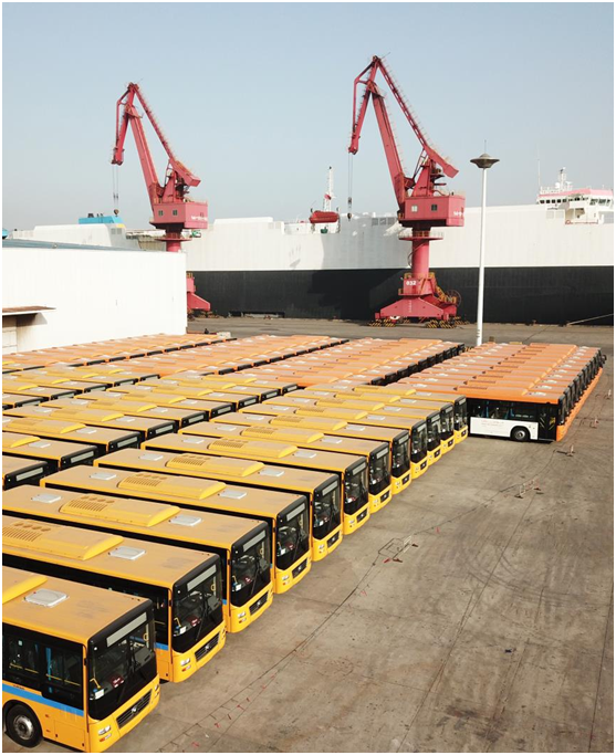 2018年2月11日、連雲港の埠頭で海のシルクロードを通って「一帯一路」沿線國?地域へ輸送されるバス(撮影耿玉和/人民視覚)