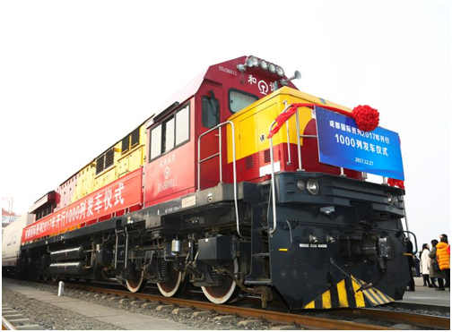 2017年12月27日、成都國際鉄道港を発つ1000本目となる成都國際列車。成都國際列車は「一帯一路」関係國を走る國際定期貨物列車「中歐班列」で最も広く、路線が多く、安定し、産業(yè)牽引効果が著しい(撮影白桂斌/人民視覚)