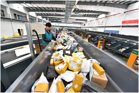 2018年3月7日、浙江省義烏國際郵便局。EMSで米國に送られる郵便物が到著。義烏國際郵便局で扱う郵便物は1億件以上。うち外國に送られる郵便物は9980萬件に上る(撮影呂斌/人民視覚)