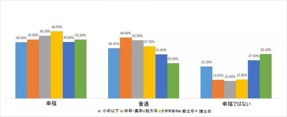 同報告によると、幸福感が高い人の割合が最も高かった世代は、大學(xué)生および社會人になったばかりの「95後(1995年から1999年生まれ)」だった。學(xué)歴別に見ると、大學(xué)學(xué)部卒の人が最高だった。