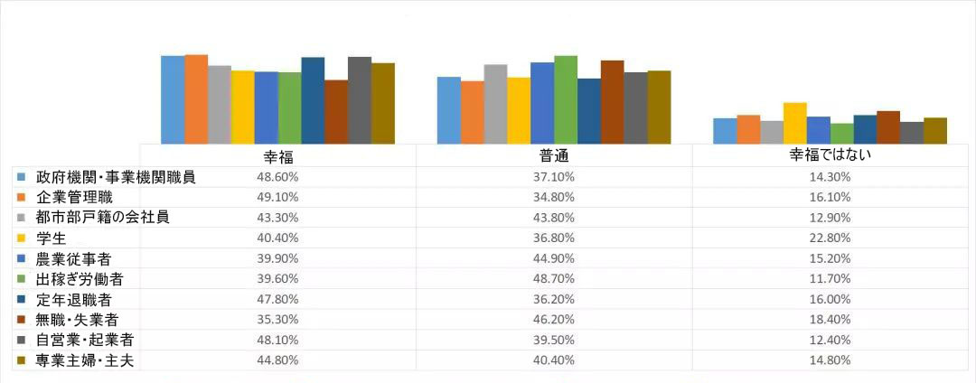 また、幸福を感じる人の割合を職業(yè)別に見たところ、幸福感を感じる人の割合が高い職業(yè)は、企業(yè)管理職、政府機(jī)関や事業(yè)機(jī)関の職員、起業(yè)者だった。