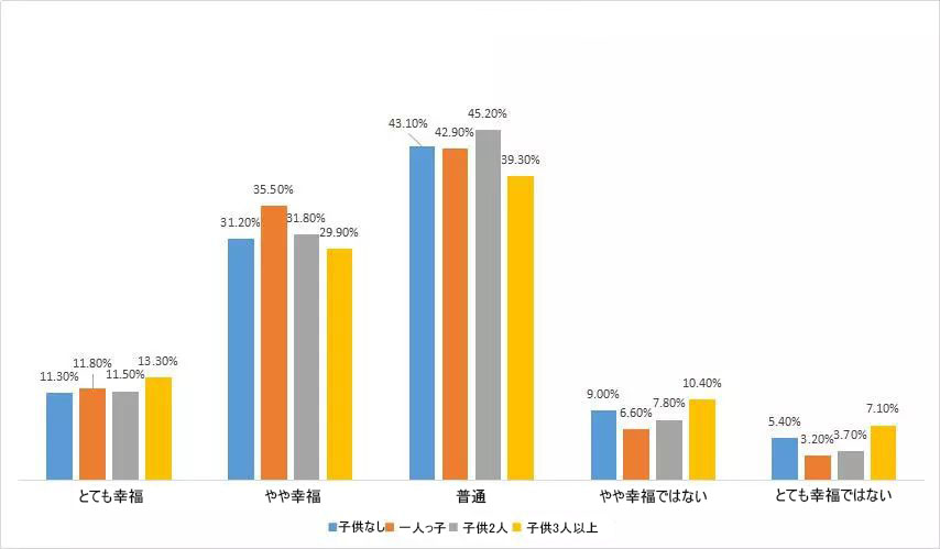 しかし同報告の結(jié)果からは「真実はさにあらず」ということが明らかになっている。幸福感が比較的高い家庭は、「一人っ子」家庭で、「とても幸?!工蓼郡稀袱浃湫腋!工却黏à咳摔胃詈悉?7.3%に達(dá)した。子供が2人の家庭がこの後に続き、43.3%だった?!感窑护扦悉胜ぁ工却黏à咳摔韦Δ痢⒆庸─?人の家庭の割合が最も高かった。しかし「とても幸福」と答えた人の中でも3人の子供がいる家庭の幸福感が最高だった。