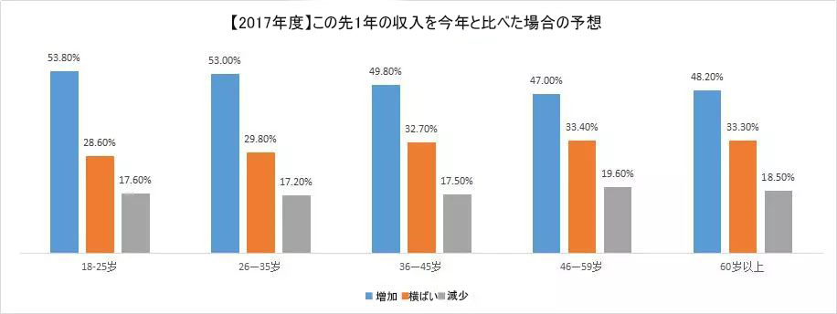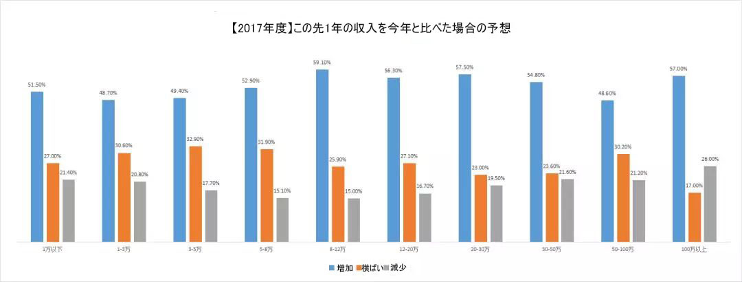 同報告によると、高所得者層の自信が最も高いわけではなかった。個人の年収が「8-12萬元(1元は約16.9円)」、「12-20萬元」、「20-30萬元」の3つの中間所得層は、収入に対する期待が比較的高く、「8-12萬元」が59.10%、「12-20萬元」が56.30%、「20-30萬元」が57.50%だった。年収1萬元以下の低所得層の期待も51.50%と、それほど低くなかった。