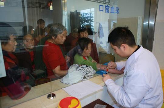 2017年4月6日、四川省広安市広安區(qū)中橋衛(wèi)生サービスセンターで、地域住民に質(zhì)の高い醫(yī)療サービスを提供するため、血液検査を行う広安區(qū)人民病院の醫(yī)師(畫像提供?廖小兵/人民視覚)。