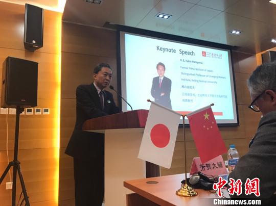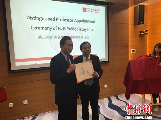 北京師範(fàn)大學(xué)のディスティングイッシュトプロフェッサーに就任した鳩山由紀(jì)夫氏 (撮影?馬元豪)。