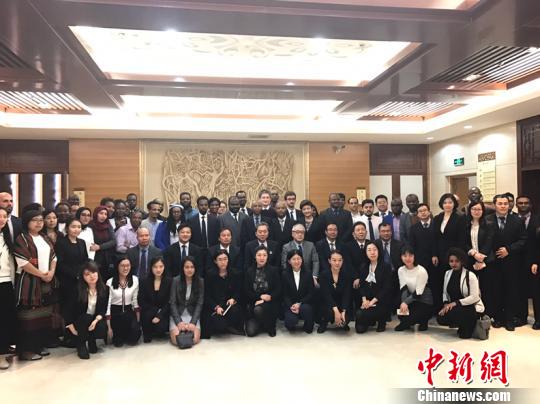 北京師範(fàn)大學(xué)の発展途上國(guó)修士學(xué)位プロジェクトの學(xué)生らと記念撮影する鳩山由紀(jì)夫氏 (撮影?馬元豪)。