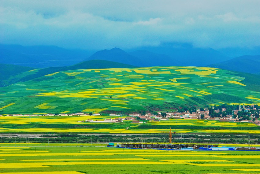 「丘は、満開の菜の花とまだつぼみのままの菜の花に包まれて、とても目に優(yōu)しい色合いになっています。」