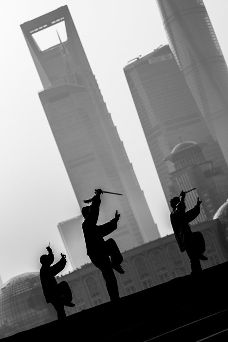 「上海外灘での太極拳の稽古風(fēng)景。高層ビルを背景に門下生が互いにシンクロしているところを表現(xiàn)しました。武術(shù)というよりはまるで剣を用いた舞踴を思わせる舞でした。」