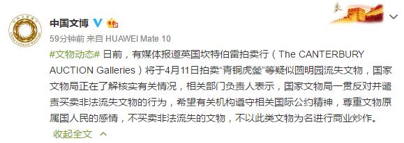國家文物局の公式微博(ウェイボー)によると、英國のカンタベリー?オークション?ギャラリーズ社が4月11日に「青銅虎鎣」など円明園から流出したとみられる文化財のオークションを開催するという某メディアの報道について、國家文物局は現在、事実確認を進めているとのコメントを発表した。當局の擔當者は、「國家文物局は、海外に違法に流出した文化財を取引する行為に対して、反対?非難の立場を貫いてきた。関連機関が國際公約の精神を遵守し、文化財をもともと保有していた國の國民感情を尊重し、海外に違法に流出した文化財の取引やこれらの文化財の知名度を利用して多額の利益を獲得しようとする企てを止めるよう、切に願っている」とコメントしている。人民網が報じた。(編集KM)
