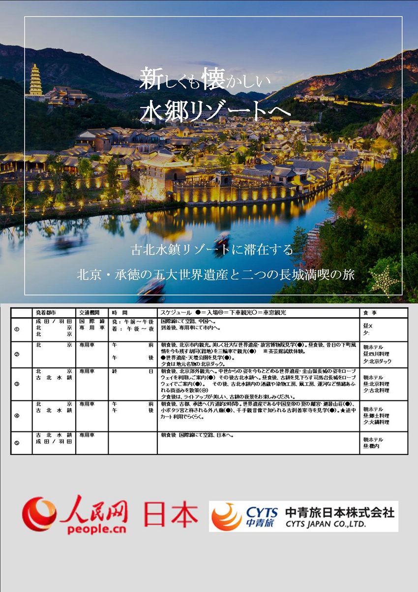二つの長城を含む北京と承徳の五大世界遺産を巡るほか、三輪車から胡同の風(fēng)景を眺め、中國の茶文化體験、酒蔵や染物工房、凧工房を體験。