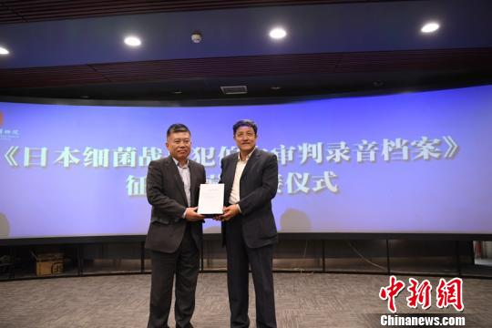 偽満皇宮博物院の王志強(qiáng)院長に「ハバロフスク裁判の音聲記録」資料と裁判の寫真を渡す湖南紅色記憶文化基金會(huì)の曹耘山理事長(寫真右、撮影?張瑤)。
