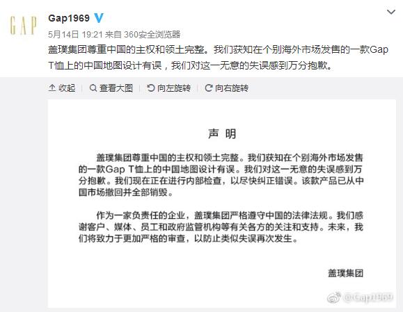 當(dāng)社は中國(guó)の主権と領(lǐng)土を尊重する。一部の海外市場(chǎng)で販売されている當(dāng)社のTシャツに描かれた中國(guó)地図のデザインに誤りがあった。これは意図せぬミスであり、心から謝罪する。
