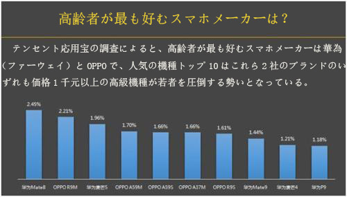 テンセント応用寶の調(diào)査によると、高齢者が最も好むスマホメーカーは華為(ファーウェイ)とOPPOで、人気の機(jī)種トップ10はこれら2社のブランドのいずれも価格1千元以上の高級(jí)機(jī)種が若者を圧倒する勢(shì)いとなっている。