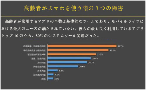 だが、高齢者についていえば、これらの高級(jí)スマホは、最も使用方法が難しい。高齢ユーザーがスマホを使う際の3つの障害は、「アプリの使用と操作方法に関する問(wèn)題」が46.7%でトップ、「スマホのシステム設(shè)定とセキュリティに関する問(wèn)題(41.2%)」、「ダウンロードのやり方が分からない(32.7%)」だった。