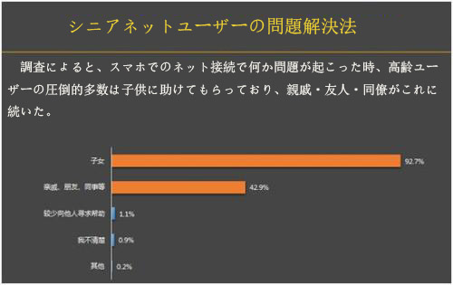 普段からスマホの使い方を両親にしばしば教えているという人は少なくないのではないだろうか?調(diào)査によると、スマホでのネット接続で何か問(wèn)題が起こった時(shí)、高齢ユーザーの圧倒的多數(shù)は子供に助けてもらっており、親戚?友人?同僚がこれに続いた。