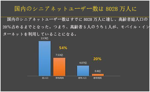 國(guó)內(nèi)のシニアネットユーザー數(shù)はすでに8028萬(wàn)人に達(dá)し、高齢者総人口の20%占めるまでとなった。つまり、高齢者5人のうち1人が、モバイル?インターネットを利用していることになる。
