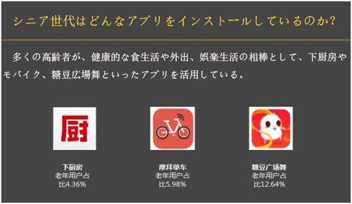 また健康を追い求める中高年層にとって、アプリは非常に頼もしい味方となっている。多くの高齢者が、健康的な食生活や外出、娯楽生活の相棒として、下廚房やモバイク、糖豆広場(chǎng)舞といったアプリを活用している。