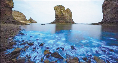 遼寧省大連市旅順口區(qū)小黒石海浜浴場(chǎng)の一部の海面がこのほど、夜間になると「蛍光?!工尉坝Qを呈している。波が岸辺や巖礁に打ち付けると透き通るような青い光を放ち、息を呑むほどの美しさだ。このため多くの観光客がひと目見ようと現(xiàn)地を訪れ、撮影している。科技日?qǐng)?bào)が伝えた。