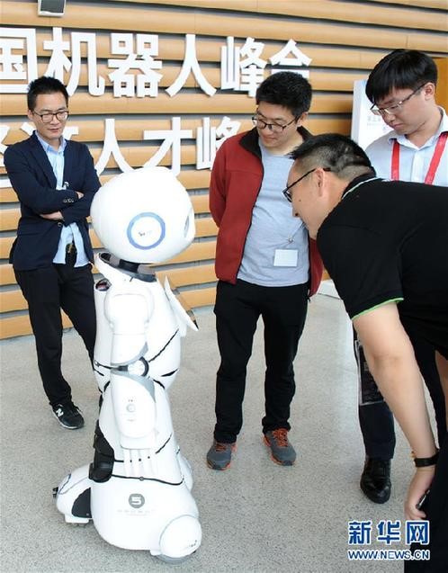 第5回中國(guó)ロボットサミットで、サービスロボットと交流する見(jiàn)學(xué)者(5月10日撮影?陳斌栄)。