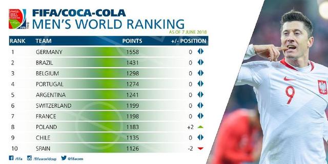 北京時間6月7日、國際サッカー連盟(FIFA)が最新世界ランキングを公式サイトに発表した。前回のランキングと比べると、ランキング上位7ヶ國の顔ぶれはほぼ変わらず、前回W杯王者のドイツが首位、第2位から第5位は順に、ブラジル、ベルギー、ポルトガル、アルゼンチンだった。東方網(wǎng)が伝えた。