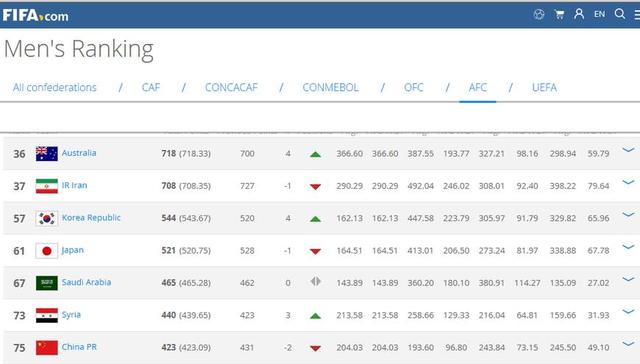 中國の順位は第75位で前回から2位後退した。これは、中國代表チームの歴代平均ランキングを下回る結(jié)果となった。アジア?太平洋地域に焦點を絞ると、アジアサッカー連盟(AFC)に加入しているオーストラリアが第36位でアジア首位、アジアランキングの第2位から第4位は、順に、イラン、韓國、日本。中國はアジア第7位に後退した。