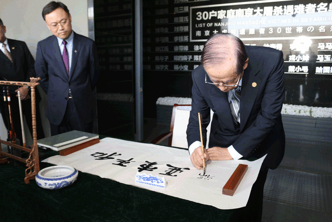 福田氏は張建軍館長の案內(nèi)で資料展を見學した後、犠牲者に花輪を手向け、黙とうを捧げました。また、「和平東亜」と揮毫したほか、張館長から中日および第三國の人々の証言と一次資料を集めた『人類の記憶ー南京大虐殺の実証』(日本語版)と平和の徽章の贈與を受けました。