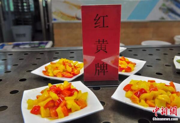 この料理はパプリカの炒め物だ。四角く切られた赤パプリカは「レッドカード」、黃色パプリカは「イエローカード」を表している。