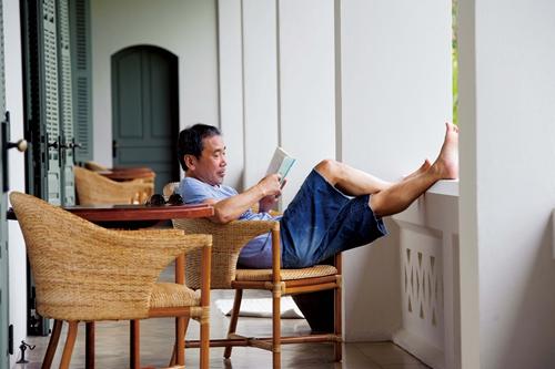 庭の見えるベランダでリラックスして読書を楽しむ村上春樹。(畫像は新経典文化から)