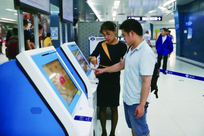 (中)在地鐵機(jī)場線東直門站,6臺藍(lán)白色值機(jī)設(shè)備一字排開。乘客將二代身份證放置在設(shè)備上,就可以打印登機(jī)牌并且選擇座位。