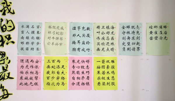 陽光學(xué)校の教室の壁に設(shè)けられた故事成語學(xué)習(xí)コーナー(汪婉參事官提供)
