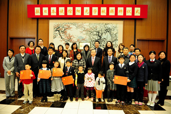 程永華氏が駐日本中國(guó)大使に就任すると、10年9月には「陽(yáng)光中國(guó)語(yǔ)教室」を開(kāi)設(shè)したが、殘念なことにそれから數(shù)ヶ月後の11年3月に東日本大震災(zāi)が発生し、津波の影響で福島第一原発事故が発生した。大使館の職員の家族は全員帰國(guó)し、「陽(yáng)光教室」も閉鎖せざるを得なくなってしまった。それから約1年半、中國(guó)大使館の職員は家族も子供も日本にいないという特殊な狀況が続いた。そして、12年10月になってようやく「陽(yáng)光教室」が再起動(dòng)し、教師の資格を持つ外交官の家族に教師を擔(dān)當(dāng)してもらうことになった。13年1月、楽參事官率いる中國(guó)外交部(外務(wù)省)と教育部(省)連合業(yè)務(wù)グループが在日本中國(guó)大使館を訪問(wèn)したことをきっかけに、在日本中國(guó)大使館の陽(yáng)光學(xué)校が正式に開(kāi)校。同校は、中國(guó)外交部が海外の大使館に開(kāi)設(shè)した12校目の陽(yáng)光學(xué)校で、アジアでは第1校目となった。