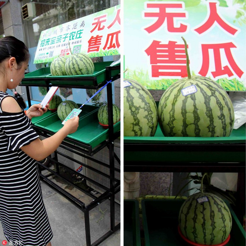 安徽省寧國市の無人スイカ販売店でモバイルペイメントを使ってスイカを買う1人の市民(7月21日、撮影?李青松)。