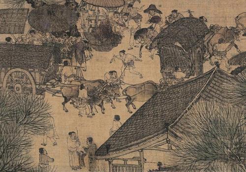 川に沿って行くと、大きな城門があり、その近くに、荷物を擔(dān)ぐ人、馬に乗った人、さらに、棒を持って「道を開けて!」と言っているような人がいる。また、賑やかな街の傍らでは、大人二人が會話に話を咲かせ、その隣で子供がため息をつきながら「もう、早く帰ろうよ」と言わんばかりの顔をしている。